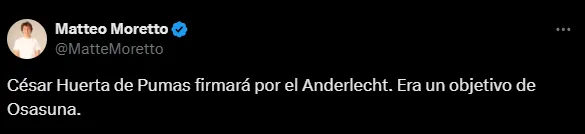 Hace unos días había trascendido la información de que el Osasuna de España tenía interés en el mexicano y que directivos de Pumas estuvieron en el país. Luego, César Luis Merlo, otro periodista especializado en el mercado de fichajes, reveló este domingo que el Anderlecht hizo una oferta por el Chino Huerta.