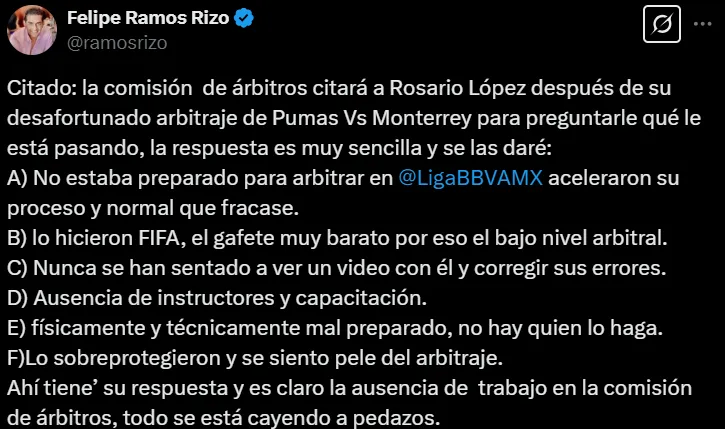 Por otro lado, Felipe Ramos Rizo, ex árbitro mundialista y actual analista de ESPN, reveló a través de su cuenta personal de X (ex Twitter) que la Comisión de Árbitros citará a Ismael Rosario López como consecuencia de su polémico arbitraje en Pumas vs. Rayados. En esa línea, el representante de México en Corea-Japón 2002 dio a conocer las razones que podrían explicar el bajo nivel que mostró el mencionado colegiado en uno de los partidos más importantes de la Jornada 12 del Clausura 2025.