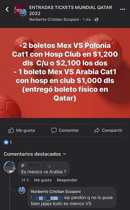 De acuerdo a ESPN, el hijo del exportero del Cruz Azul publicó en el grupo de Facebook “Entrada Tickets Mundial Qatar 2022” la venta de boletos Hospitality Club. Los dos tickets exibidos para el juego ante los polacos estaban ofrecidos en 2100 dólares (más de 41 mil pesos), mientras que contra los árabes cotizaban en 1000 dólares (casi 20 mil pesos).