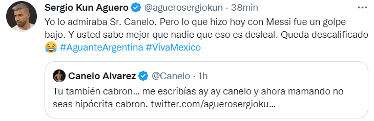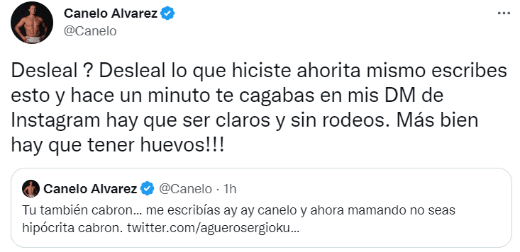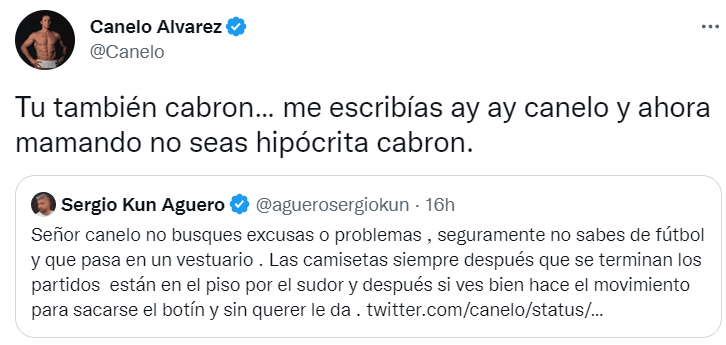 Canelo no se quedó callado y encendió aún más la llama de la discusión, al tildar al Kun de hipócrita por aparentemente hablarle bien por privado y luego contestarle así en público:“Tu también cabron… me escribías ay ay canelo y ahora mamando no seas hipócrita cabron“.