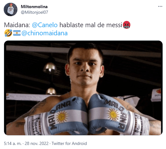 Al ver la desafiante actitud de Canelo Álvarez en su cuenta de Twitter, que le valió crítica incluso de parte de muchos de sus compatriotas, un gran número de usuarios argentinos comenzó a buscar quien defienda a Lionel Messi de la amenaza del tapatío. Y la elección fue casi unánime: Marcos Maidana.