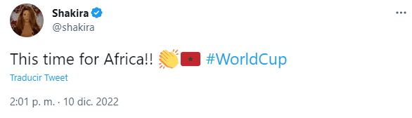 “This time for África”, canta Shakira en el popular Waka Waka, que sonó hasta el hartazgo tanto en la previa como durante y después de quel Mundial que coronó a España con Piqué en cancha. Este sábado, la colombiana recuperó la frase para celebrar la sorpresiva victoria de Marruecos sobre Portugal.