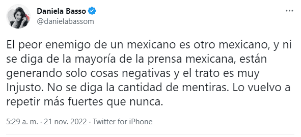 A un día del debut del Tri en el Mundial de Qatar, enfrentando a Polonia en el Estadio 794 de Doha, quien salió a defender a Jiménez de esos haters fue su pareja Daniela Basso. “El peor enemigo de un mexicano es otro mexicano, y ni se diga de la mayoría de la prensa mexicana, están generando solo cosas negativas y el trato es muy Injusto. No se diga la cantidad de mentiras. Lo vuelvo a repetir más fuertes que nunca”, escribió en su cuenta de Twitter.