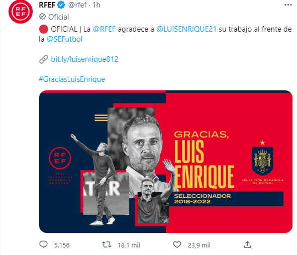 “La RFEF desea enérgicamente la mejor de las fortunas a Luis Enrique y su equipo de trabajo en sus futuros proyectos profesionales. El técnico se lleva el cariño y la admiración de sus colaboradores en la selección y de toda la Federación, que siempre será su casa”, se agrega.