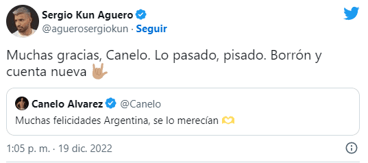 Curiosamente, quien no tardó en responder a la felicitación del Canelo fue Sergio Kun Agüero, quien había salido en defensa de Messi con provocaciones al mexicano y que ahora dejó a muchos la duda sobre si su mensaje fue un gesto de paz a una nueva provocación al boxeador.