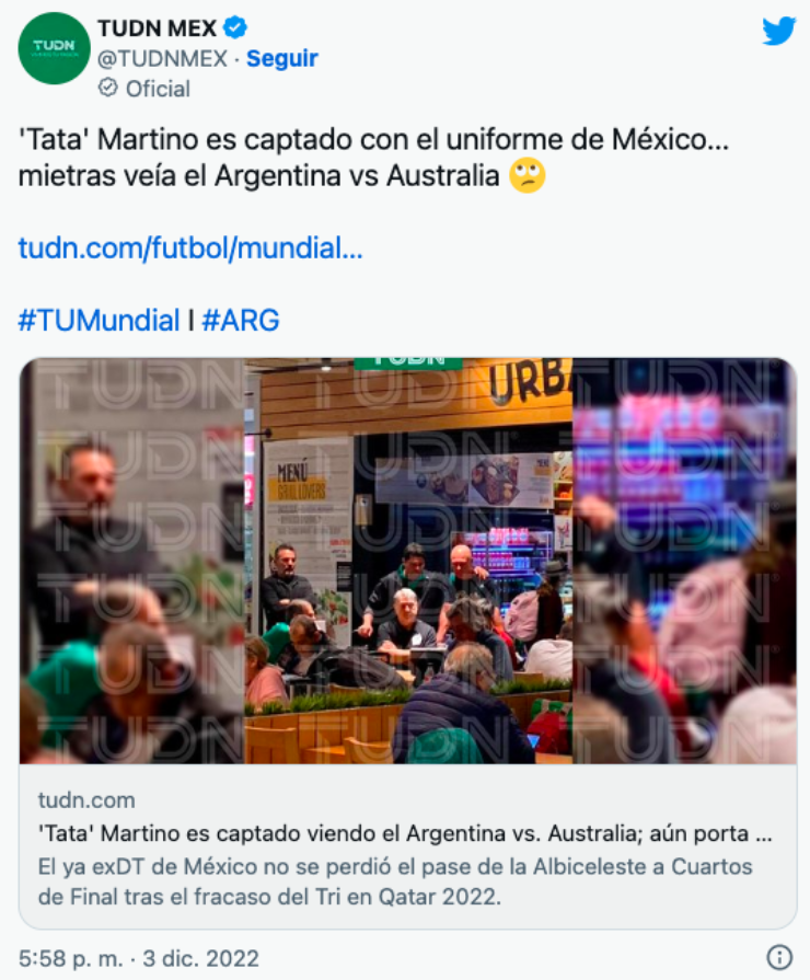 La imagen que circula en las redes sociales, se puede observar a Martino siguiendo cada detalle de la victoria de los sudamericanos. El estratega fue visto con el uniforme de la Selección Mexicana, a pesar de que se confirmó que ya no continuará en el Tri.