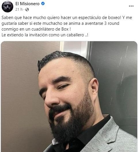 “Saben que hace mucho quiero hacer un espectáculo de boxeo! Y me gustaría saber si este muchacho se anima a aventarse 3 rounds conmigo en un cuadrilátero de box. Le extiendo la invitación como un caballero…!“, escribió El Misionero junto a una foto del narrador televisivo en primer plano.