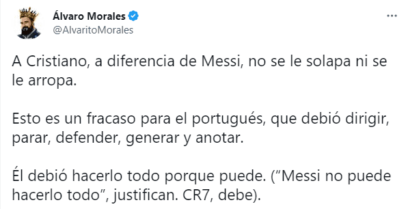 “¿No le dan el balón a CR7 a propósito?”, se preguntó ante la inacción del jugador de 37 años. Y ya finalizado el encuentro, lo excusó: “A Cristiano, a diferencia de Messi, no se le solapa ni se le arropa.Esto es un fracaso para el portugués, que debió dirigir, parar, defender, generar y anotar”.