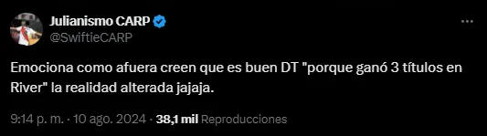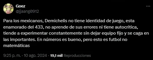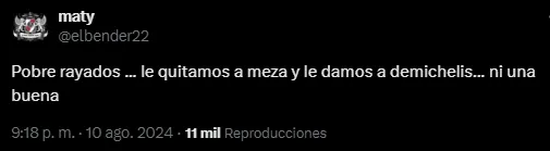 Las opiniones de los simpatizantes rojiblancos en torno a esta noticia han sido distantes unas de otras. Las primeras y más en ‘caliente’ fueron poco optimistas para la afición de Rayados, ya que los fanáticos de River realizaron descripciones de los aspectos negativos de Demichelis, algunos de los cuales se asemejan a lo criticado al ‘Tano’ Ortiz.