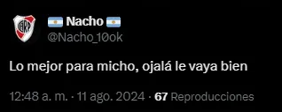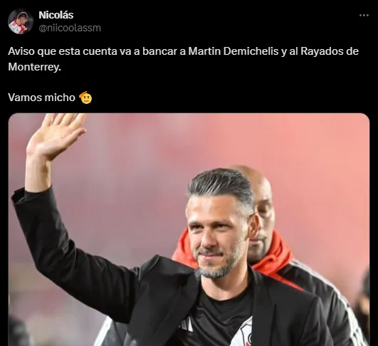 Otros aficionados riverplatenses, en cambio, despidieron a Demichelis con buenas sensaciones y le desearon éxitos en su nueva experiencia en el futbol mexicano, incluso anticipando que se harán simpatizantes de Monterrey mientras que el ex DT de River esté al frente del conjunto regiomontano.