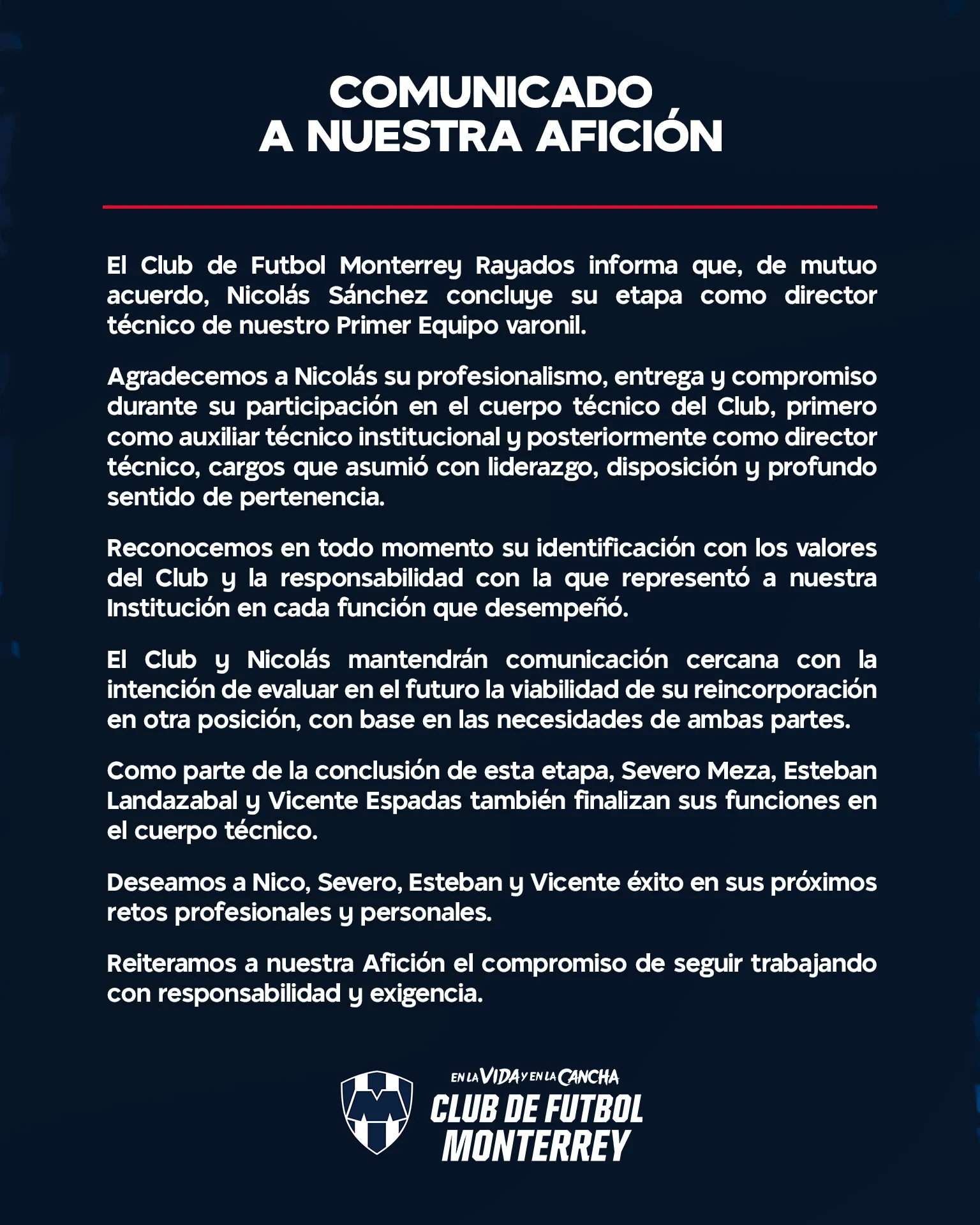 A través de un comunicado oficial, Monterrey informó: “El Club de Futbol Monterrey Rayados informa que, de mutuo acuerdo, Nicolás Sánchez concluye su etapa como director técnico de nuestro Primer Equipo varonil”.