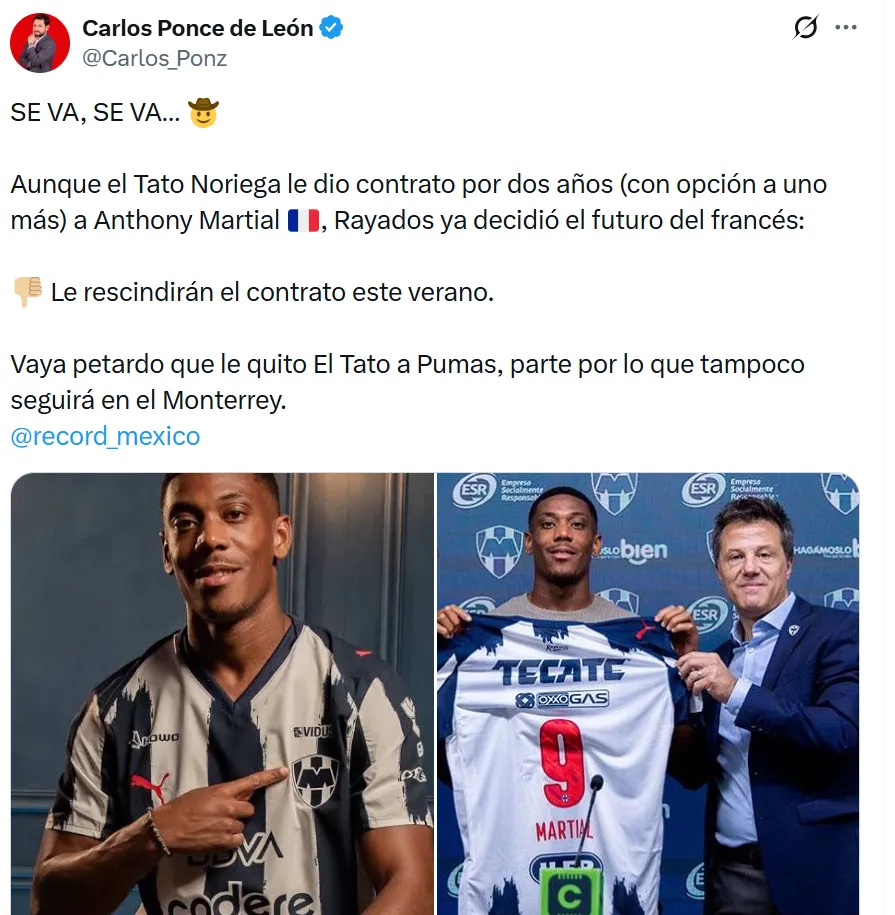 La reestructuración no terminaría solamente con cambios en el cuerpo técnico. Según información del periodista Carlos Ponz, Rayados ya tomó la decisión de rescindir el contrato de Anthony Martial, francés que llegó como estrella y que no rindió.