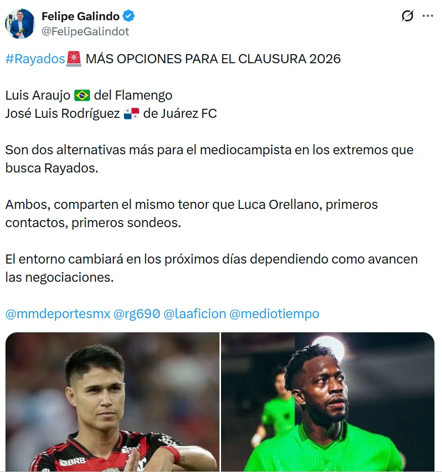 Según informó el periodista Felipe Galindo, Rayados está en la búsqueda de un extremo para el próximo torneo y uno de los nombres que más fuerza tomó es el de Luiz Araújo, futbolista del Flamengo. El brasileño fue campeón de la Copa Libertadores y es visto como una pieza ideal para potenciar las bandas, gracias a su velocidad y desequilibrio en el uno contra uno.