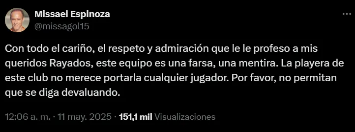 Las críticas no tardaron en llegar. La afición expresó su enojo en redes sociales, pero también algunos exjugadores. Uno de ellos fue Missael Espinoza, canterano del club, que no dudó en explotar públicamente tras el papelón de Rayados en la Liguilla.