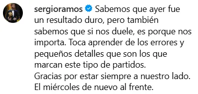“Sabemos que ayer fue un resultado duro, pero también sabemos que si nos duele, es porque nos importa. Toca aprender de los errores y pequeños detalles que son los que marcan este tipo de partidos. Gracias por estar siempre a nuestro lado. El miércoles de nuevo al frente”, escribió Ramos en su cuenta personal de Instagram.