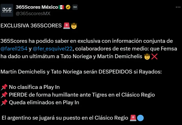 Según informaron Fernando Esquivel y Diego Farell en 365 Scores México, FEMSA ya puso un ultimátum tanto para Demichelis como para Noriega. Si Rayados pierde ante Tigres en el Clásico Regio, no clasifica al Play In o si es eliminado en el Play In, tomarán la decisión de destituirlos de su cargo.