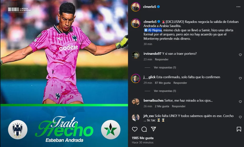 Según reveló el periodista César Luis Merlo, el Al-Najma ya hizo una oferta formal por el futbolista de Rayados. Sin embargo, hasta el momento no hay acuerdo debido a diferencias económicas que complican su salida y todo dependerá de si pueden destrabarlo.