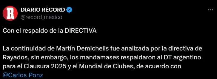 Según informó el periodista Carlos Ponce de León en Diario Récord, el ex River Plate se reunió este lunes con la directiva para hablar sobre su futuro. A pesar de los rumores sobre su salida, Martín Demichelis cuenta con todo el apoyo de Tato Noriega y la directiva de Rayados para afrontar lo que resta de la temporada.