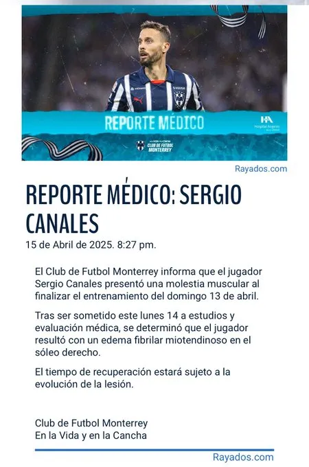 Sin embargo, pese a la última comunicación, el periodista Diego Armando Medina, ‘insider’ de Monterrey, ha podido confirmar que el tiempo de baja de Sergio Canales no termina en las ‘Águilas’: el español no volverá sino hasta el primer partido de Play-In o Liguilla, según corresponda de acuerdo a la posición final de Rayados al cabo de la jornada 17. De esta manera, el volante queda fuera de los últimos dos partidos de la fase regular (también del cierre ante León).