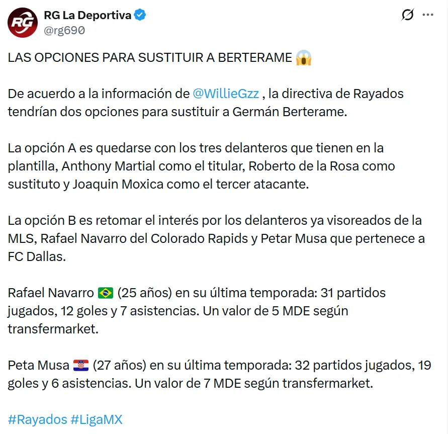 Más allá de los nombres que suenan, en Rayados también se analiza la posibilidad de no sumar refuerzos en ataque. En ese escenario, el cuerpo técnico apostaría por el plantel actual, con Anthony Martial como principal referencia ofensiva, Roberto de la Rosa como primera alternativa y Joaquín Moxica ocupando el rol de tercer delantero.