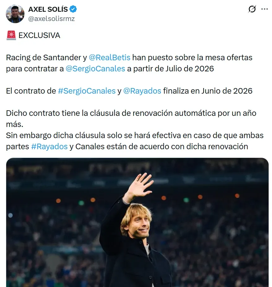 - Sergio Canales recibió propuestas de Racing de Santander y Real Betis para mediados de 2026.