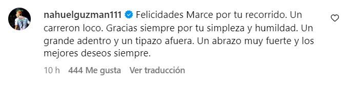“Felicidades, Marce, por tu recorrido. Un carrerón, loco. Gracias siempre por tu simpleza y humildad. Un grande adentro y un tipazo afuera. Un abrazo muy fuerte y los mejores deseos siempre”, le comentó Nahuel Guzmán, histórico de Tigres UANL, a Barovero, ex campeón con Rayados.