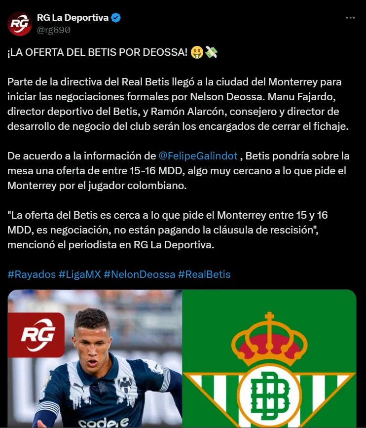 “La oferta del Betis es cerca a lo que pide el Monterrey entre 15 y 16 MDD, es negociación, no están pagando la cláusula de rescisión”, es lo que reveló el periodista Felipe Galindo.De esta manera, a Rayados le ingresaría una cifra más importante por Deossa, aunque eso no cambia el golpe que significaría perder a una de sus grandes figuras en plena temporada.