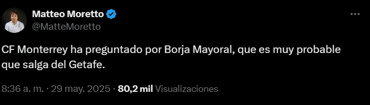 Según lo que informó el periodista Matteo Moretto, Rayados de Monterrey ha preguntado por Borja Mayoral, delantero español de 28 años que pertenece al Getafe y que seguramente no siga en su actual equipo. Rayados ha apostado a varios españoles en los últimos años y esta no sería la excepción.