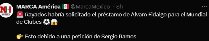 Según informó Marca América, Rayados de Monterrey habría solicitado el préstamo de Álvaro Fidalgo, español naturalizado mexicano que juega en América. Sergio Ramos habría pedido su fichaje para que sea uno de los refuerzos permitidos por la FIFA para el Mundial de Clubes.