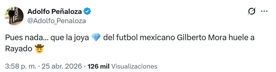 “Pues nada… que la joya del fútbol mexicano Gilberto Mora huele a Rayado”, escribió el periodista Adolfo Peñaloza, dejando abierta la posibilidad de que Rayados de Monterrey intente quedarse con el futbolista en el próximo mercado de pases.