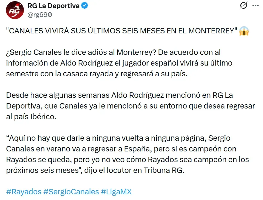 Sobre este tema habló el periodista Aldo Rodríguez, de RG La Deportiva, quien fue contundente al analizar el escenario que se viene. “Aquí no hay que darle vueltas a nada: Sergio Canales en verano va a regresar a España. Solo si es campeón con Rayados se queda, pero yo no veo cómo Rayados sea campeón en los próximos meses”, aseguró, dejando en claro su postura.