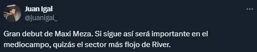 Para el comienzo del segundo tiempo, el entrenador decidió enviar a Maxi al campo de juego. Antes de los 10 minutos de haber ingresado, Meza participó en la jugada del primer gol de River. Y no solo eso, sino que tuvo una muy buena actuación.