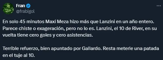 Este sábado, River se enfrentó a Gimnasia en una nueva jornada del torneo argentino. En principio, Marcelo Gallardo decidió dejar a Maxi Meza en la banca, ya que tuvo poco tiempo junto al equipo. Sin embargo, solo 45 minutos le bastaron al mediocentro para hacer su debut.