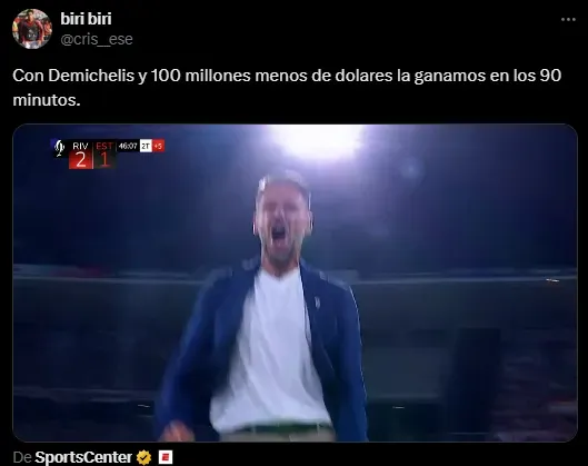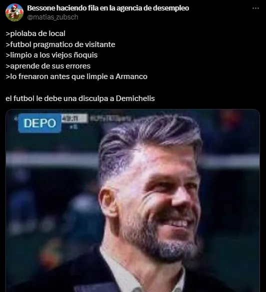 En estos días, y sorprendentemente por cómo han cambiado y dado vuelta las cosas, Demichelis es extrañado en River y cuestionado en Rayados, donde todavía no pudo lograr esas coronaciones que sí consiguió en Argentina y por las cuales la directiva de Monterrey lo contrató tras despedir al ‘Tano’ Ortiz. A continuación, algunos de los posteos virales de la noche.