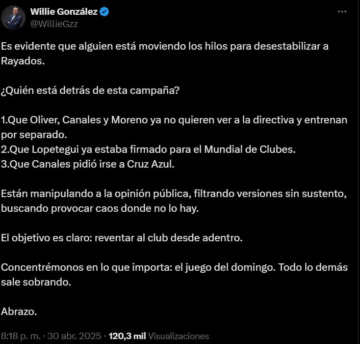 Willie rGonzález denuncia una campaña para desestabilizar a Rayados