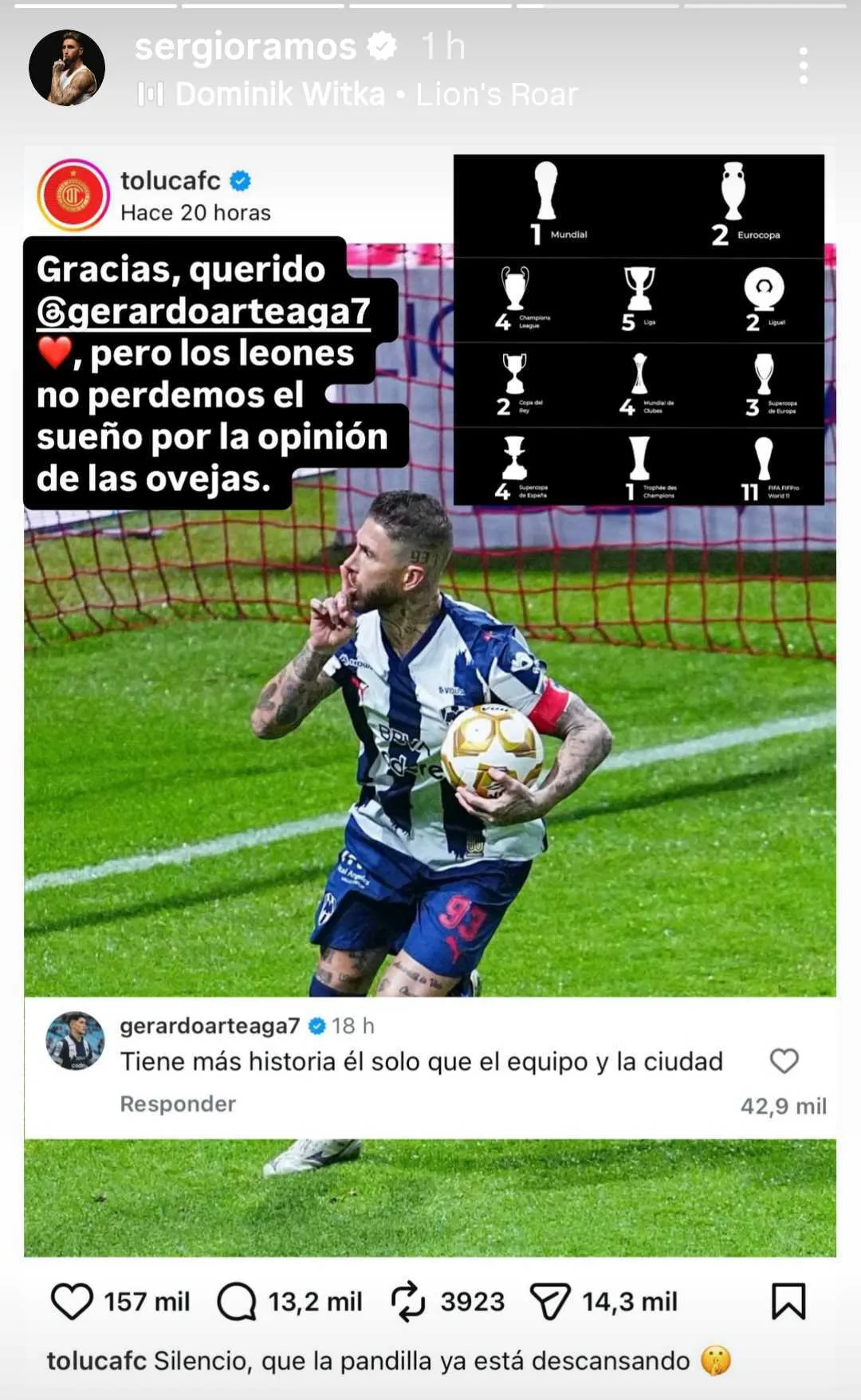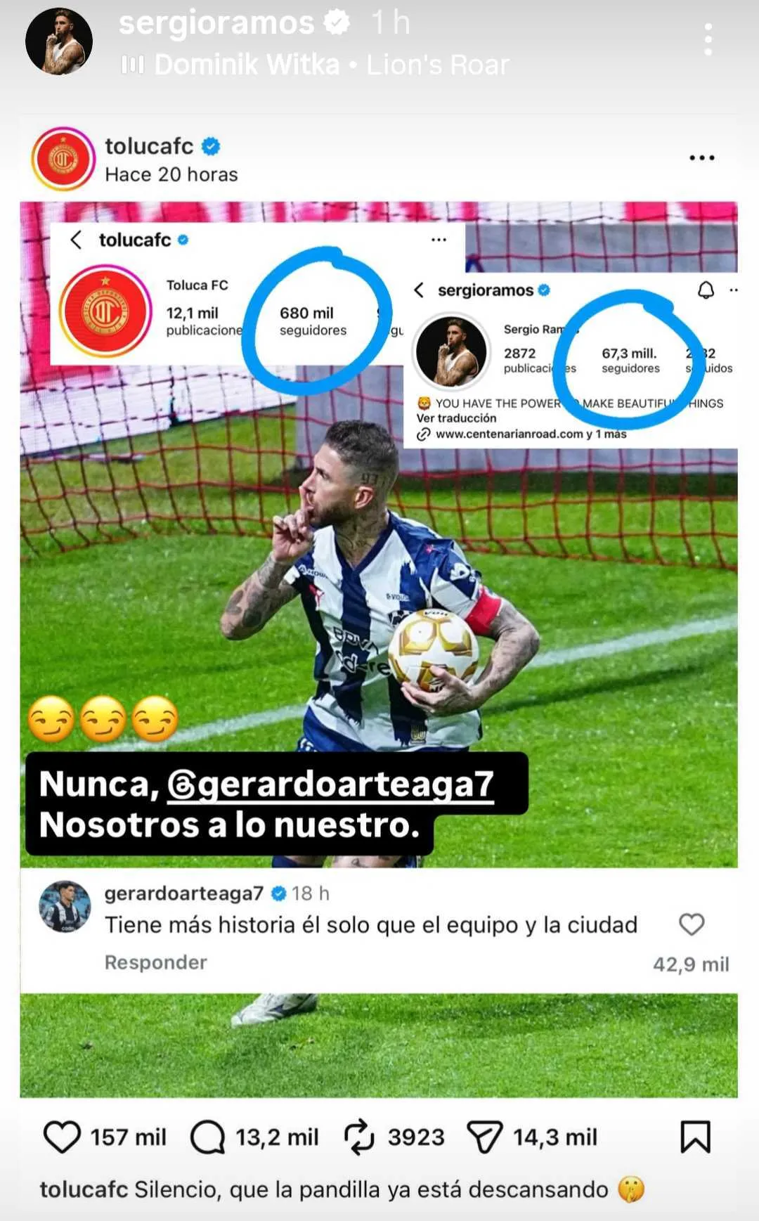- Sergio Ramos respondió a la burla de Toluca en Instagram Stories comparando sus 67.3 millones de seguidores con los 680 mil del club.