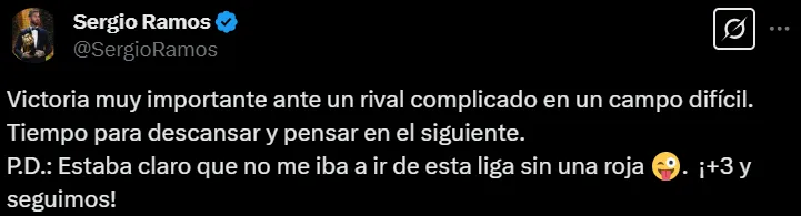 “Victoria muy importante ante un rival complicado en un campo difícil. Tiempo para descansar y pensar en el siguiente. P.D.: Estaba claro que no me iba a ir de esta liga sin una roja. ¡+3 y seguimos!”, escribió el ex Real Madrid en su cuenta personal de X (ex Twitter).