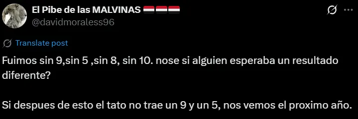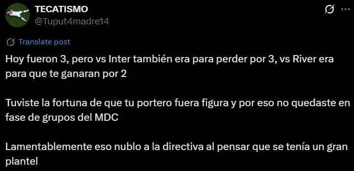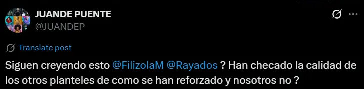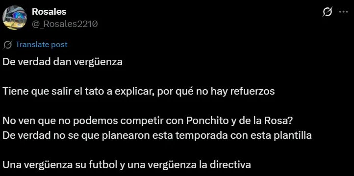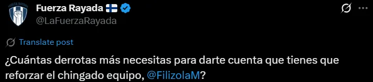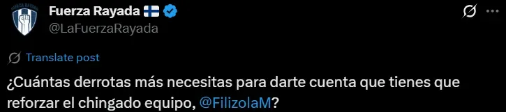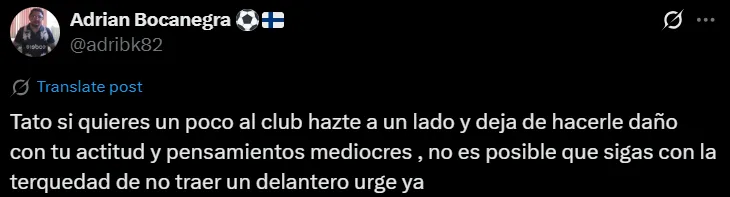 Al respecto, se pudieron leer comentarios tales como: “¿Cuántas derrotas más necesitas para darte cuenta que tienes que reforzar el equipo, @filizolam?“, “Tato (Noriega), si quieres un poco al club hazte a un lado y deja de hacerle daño con tu actitud y pensamientos mediocres”, “una vergüenza la directiva” y “es momento de que la directiva dé la cara”.