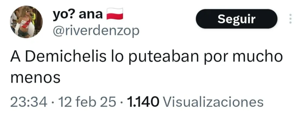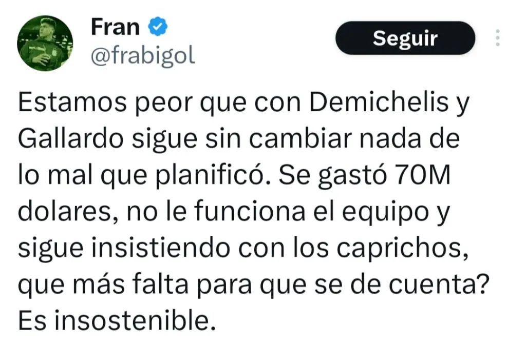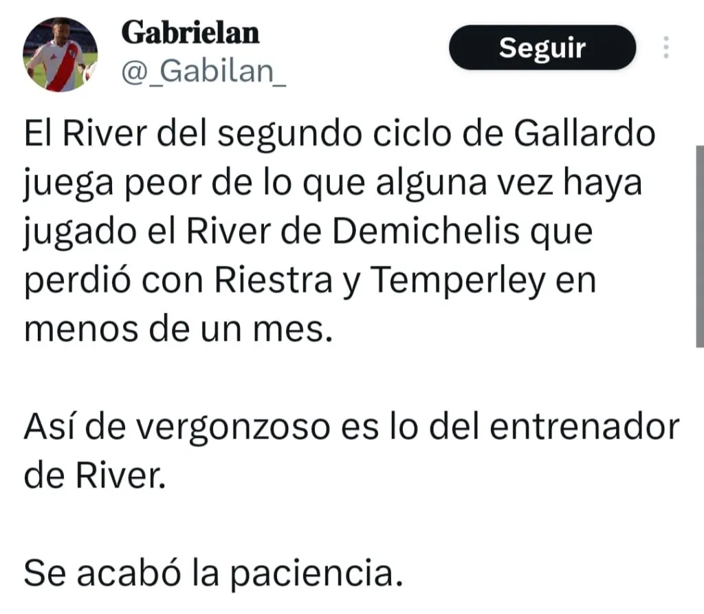 “El River del segundo ciclo de Gallardo juega peor de lo que alguna vez haya jugado el River de Demichelis, que perdió con Riestra y Temperley en menos de un mes. Así de vergonzoso es lo del entrenador de River. Se acabó la paciencia.” fue uno de los comentarios más duros en redes. Otro hincha agregó: “Estamos peor que con Demichelis y Gallardo sigue sin cambiar nada de lo mal que se planificó. Se gastaron 70 millones de dólares, no le funcionó el equipo y sigue insistiendo con los caprichos. ¿Qué más falta para que se dé cuenta? Es insostenible.”