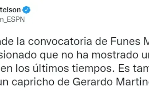A través de su cuenta de Twitter, el periodista de ESPN arremetió contra Martino por considerar que el Mellizo no trae el rendimiento que requiere la Selección Mexicana. “No se entiende la convocatoria de Funes Mori…Es un futbolista lesionado que no ha mostrado un gran nivel competitivo en los últimos tiempos. Es también, una terquedad, un capricho de Gerardo Martino…”, escribió.