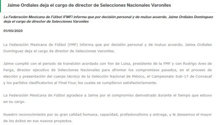 “La Federación Mexicana de Fútbol (FMF) informa que por decisión personal y de mutuo acuerdo, Jaime Ordiales Domínguez deja el cargo de director de Selecciones Varoniles. […] Jaime cumplió con el periodo de transición acordado con Yon de Luisa, presidente de la FMF, y con Rodrigo Ares de Parga, director ejecutivo de Selecciones Nacionales, para afrontar los compromisos pasados”, se lee en parte del comunicado.