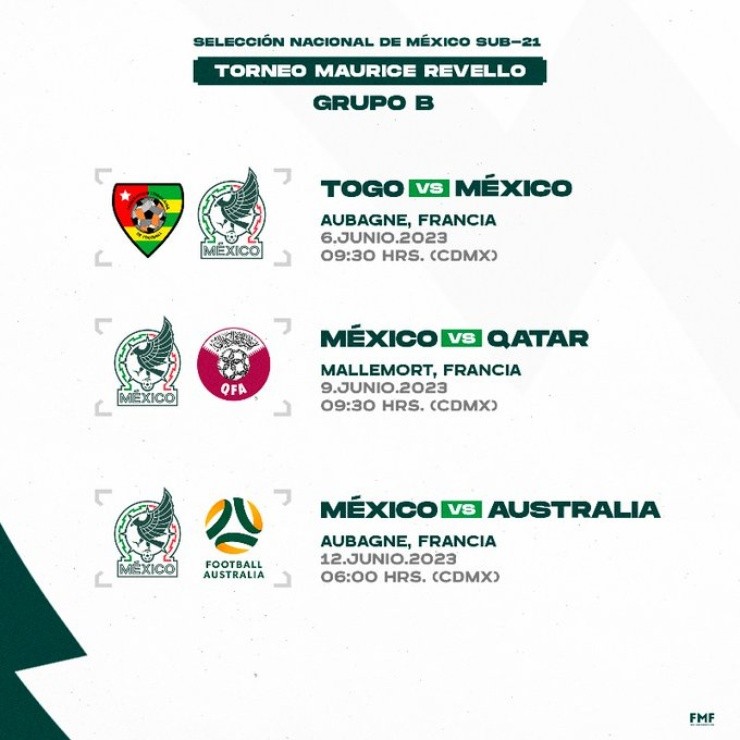 El Tri será uno de los integrantes del Grupo B del Torneo Maurice Revello, instancia en la que competirá por la clasificación a la siguiente ronda junto a Australia, Togo y Qatar, rivales a los que enfrentará entre el 6 y 12 de junio.