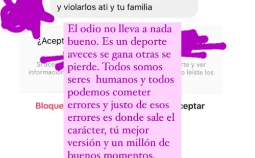 La pareja del histórico cancerbero tapó el resto de los improperios con un mensaje de opinión propia: “El odio no nos lleva a nada bueno. Es un deporte, a veces se gana y a veces se pierde. (…) Calma que falta camino por recorrer y estoy segura que les darán muchas alegrías a México. Mejor trabajen y ocúpense por el bien de sus familias y seres queridos”.