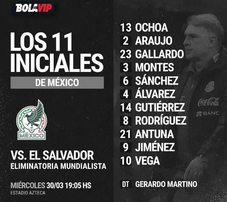 Para vencer a El Salvador y clasificar al Mundial de Qatar 2022, Gerardo Martino propone este equipo titular: Guillermo Ochoa; Jorge Sánchez, Johan Vásquez, César Montes y Erick Aguirre; Carlos Rodríguez, Edson Álvarez, Erick Gutiérrez;Uriel Antuna, Raúl Jiménez yAlexis Vega.