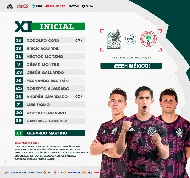 La Selección Mexicana dio a conocer la alineación con la que Martino afronta el inicio de la gira de amistosos por Estados Unidos. El once del Tri está conformado por los siguientes jugadores: Rodolfo Cota, Héctor Moreno, César Montes, Erick Aguirre, Jesús Gallardo, Luis Romo, Fernando Beltrán, Andrés Guardado, Rodolfo Pizarro, Roberto Alvarado ySantiago Giménez.