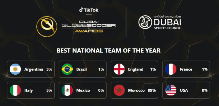 La Selección de México comparte la terna con otros ocho aspirantes: Argentina, Brasil, Italia, Inglaterra, Francia, Estados Unidos y Marruecos. Sin embargo, hasta el momento es el país del norte de África quien da el batacazo lleva la ventaja por amplia diferencia: ¡un 89% de los votos!