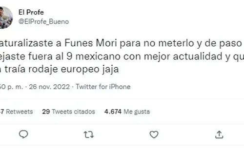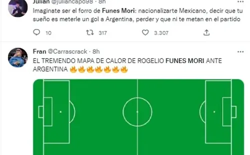 “Funes Mori cantando el himno mexicano hijo de mil p***no se te ocurra pisar argentina nunca más”, tundió un argentina. Mientras que otro tuiteó “Nacionalizarona Funes Mori para no meterlo y de paso dejaste afuera al 9 mexicano con mejor actualidad y que ya traía rodaje europeo jaja”.