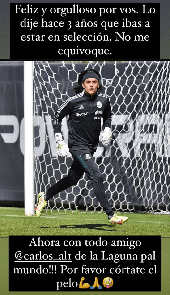 “Feliz y orgulloso por vos. Lo dije hace tres años que ibas a estar en Selección. No me equivoqué”, escribió el arquero junto a una foto de Acevedo. Pero añadió: “Ahora, con todo, amigo, Carlos Acevedo, de la Laguna pal mundo. Por favor, ¡córtate el pelo!”.