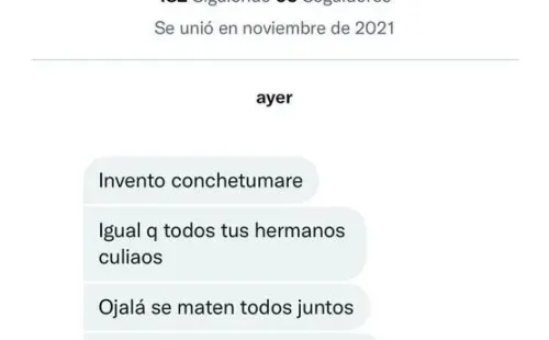 “Invento conc**tumare, igual que todos tus hermanos cul**os. Ojalá se maten todos juntos, esa wea sería un triunfo para Chile, más que ganar un Mundial. Bastardo conc**tumare”, fueron los repudiables comentarios de este usuario.