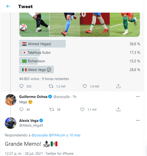 Fue Guillermo Ochoa, portero y uno de los refuerzos del cuadro azteca en el certamen, el que decidió exteriorizar su decisión. En la publicación de Twitter, el guardameta de América aseguró que el delantero de Chivas era el merecedor del premio. Luego, el ariete le contestó con un cálido “¡Grande, Memo!”.